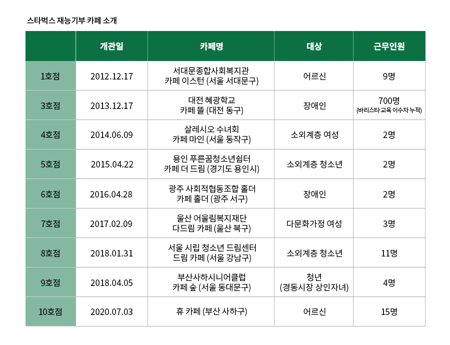 스타벅스는 2012년 12월 재능기부 카페 1호점으로 실버 바리스타가 운영하는 서대문종합사회복지관의 <카페 이스턴> 오픈을 시작으로, 대전 혜광학교의 <카페 뜰>(2013년 12월 오픈), 살레시오 수녀회의 <카페 마인>(2014년 6월 오픈), 용인 푸른꿈청소년쉼터의 <카페 더 드림>(2015년 4월 오픈), 광주 사회적협동조합 홀더의 <카페 홀더>(2016년 4월 오픈), 울산 어울림복지재단의 <다드림 카페>(2017년 2월 오픈), 서울 시립 청소년 드림센터의 <드림카페>(2018년 1월 오픈), 경동장학재단의 <카페숲>(2018년 4월 오픈), 부산사하시니어클럽의 <휴카페> (2020년 5월 오픈) 등을 재능기부 카페로 오픈했다. 또한 2019년 9월에는 전국 150여 곳 시니어 카페의 어르신 바리스타 경쟁력 강화를 위한 상생 교육장을 군포 시니어클럽에 개설하는 등 지역사회의 취약계층의 자립과 고용 창출을 위한 지속가능한 상생 활동을 이어 나가고 있다.