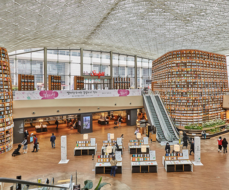 3월 26일부터 약 3주간 열린 별마당 도서관 ‘봄날의 시’ 행사는 13m 대형 서가 앞에 튤립, 수선화, 안개꽃 등 생화 17종을 볼 수 있는 꽃밭을 조성하고, ‘시 소믈리에’ 정재찬 교수가 직접 큐레이션한 유명 시인들의 작품을 전시해 오가는 사람들의 발걸음을 멈추게 했다.