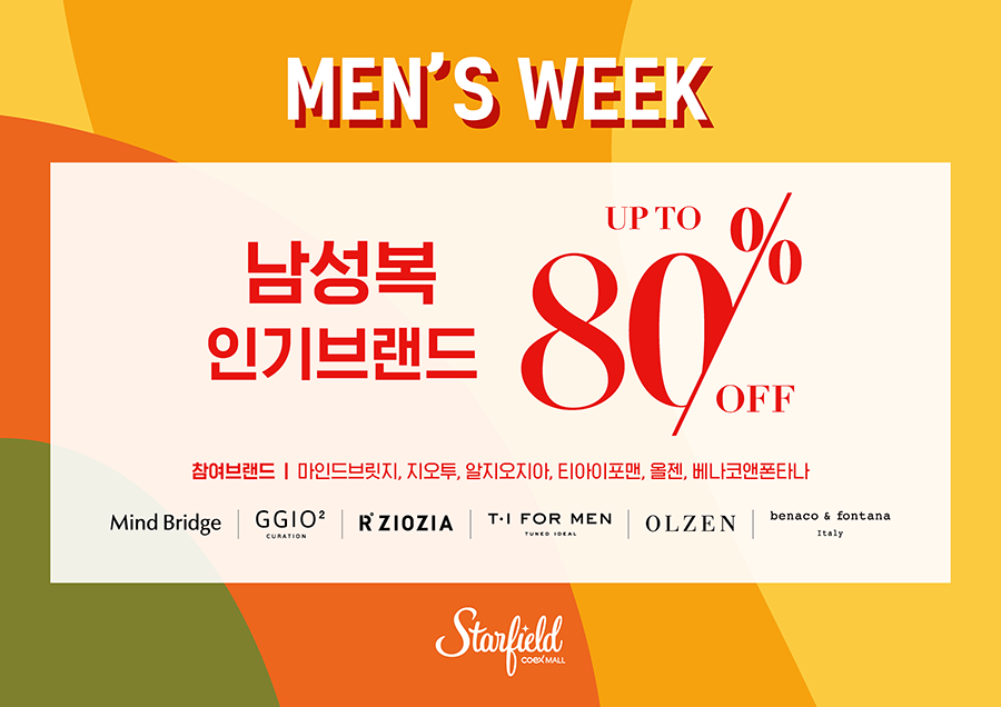 신세계프라퍼티는 스타필드 코엑스몰 지하 2층 라이브 플라자에서 오는 27일(일)까지 10일간, 인기 남성복 브랜드 제품을 최대 80% 할인 판매하는 ‘멘즈위크(Men’s Week)’를 진행한다고 18일(금) 밝혔다. ‘멘즈위크’는 패션업체들의 매출 활성화를 위한 남성복 할인 행사로, ‘지오지아’, ‘올젠’, ‘마인드브릿지’, ‘티아이포맨’, ‘지오투’, ‘베나코앤폰타나’ 등 인기 남성복 브랜드 총 6개가 참여한다.