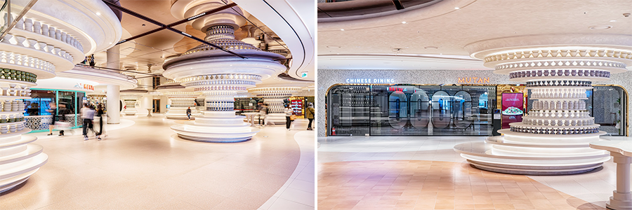 공간 디자인도 반복되는 일상을 보다 품격 있고 여유롭게 만들어 줄 수 있도록 기획했다. 특히, 밝은 아이보리 톤을 중심으로 고급 접시와 컵 등 식기류를 원기둥 벽면에 360도 전시해 스트리트 입구에 들어서자마자 고급스러운 미식의 설렘과 여운을 느낄 수 있다.