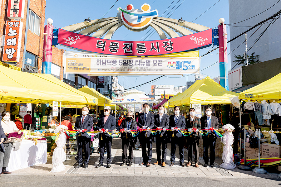 9일 하남 덕풍시장에서 진행된 리뉴얼 오프닝 행사에는 김상호 하남시장, 이임용 신세계프라퍼티 상무, 김재근 덕풍시장 회장, 황병서 덕풍5일장 부회장, 이정림 스타필드 하남 점장 등 주요 관계자들이 참석해 새 출발을 알렸다.