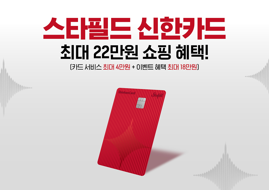 또한스타필드에서 스타필드 신한카드로 5만 원 이상 결제한 고객에게는 누적 이용 금액에 따라 최대 14만원의 캐시백이 지급된다. 신한카드 신규회원 고객(행사월 기준 최근 12개월간 신한 개인 신용카드 미이용)은 이용 금액 5/10/100/200만원 이상 이용 시 5/7/10/14만원의 캐시백을 받을 수 있다그 외 기존 신한카드 이용 고객도 풍성한 캐시백 혜택을 받을 수 있다동일한 합산 이용금액 구간별로 3/4/7/10만원의 캐시백이 지급된다.