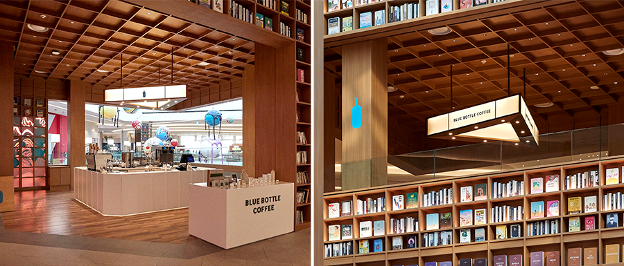 이번에 스타필드 수원에 문을 연 블루보틀 매장은 4층부터 7층까지 이어진 별마당 도서관의 대형 서가를 한눈에 내려다볼 수 있는 곳에 위치해 탁 트인 시야와 함께 별마당 도서관 서가와 어우러져 편안하고 여유로운 분위기를 자아낸다.