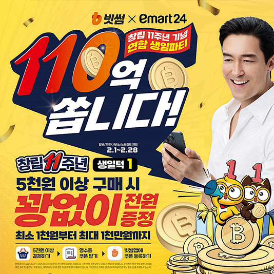 이마트24-빗썸, 창립 11주년 대규모 공동생일파티 연다!이마트24와 빗썸이 역대급 창립기념 행사를 펼친다.