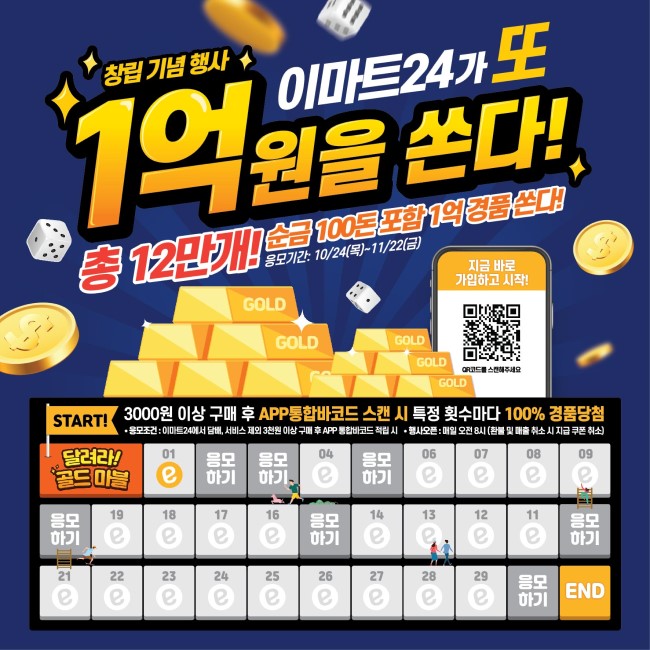 이마트24, 총 1억원 경품 ‘또’ 쏜다!이마트24가 이달 24일(목)부터 다음달 22일(금)까지 창립 2주년 대고객이벤트 2탄으로 ‘1억 경품 행사’를 다시 한번 이어간다.