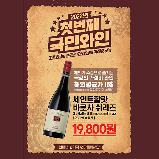 이마트, 올해 첫 국민와인 선보인다.. ‘세인트할랏 바로사 쉬라즈’ 19,800원 판매다양한 와인을 합리적인 가격에 소개하며 국내 와인 저변 확대에 앞장서왔던 이마트가 올해 첫 국민와인을 선보인다. 이마트는 22년 첫 국민와인으로 ‘세인트할랏 바로사 쉬라즈’를 선정해 오는 31일(목)부터 본격 판매(19,800원)에 돌입한다고 밝혔다.