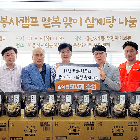 조선호텔앤리조트, 말복 더위 이겨낼 든든한 보양식 기부활동조선호텔앤리조트(대표이사 한채양)가 서울시자원봉사센터와 협력해 진행한 ‘노플라스틱 한강 빗물받이 지킴 활동’의 목표를 달성하며, ‘조선호텔 삼계탕’ 밀키트 제품 500여개를 사회적 취약 계층에게 전달했다.