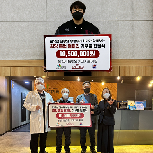 SSG랜더스(대표이사 민경삼, 이하 SSG)의 주장 한유섬 선수가 올해로 6년째 부평우리치과와 함께하는 ‘희망 홈런 캠페인’을 통해 적립한 기부금을 전달했다.