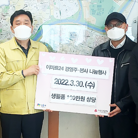 이마트24, 올해 첫 동행기부 진행! 올해도 가맹점과 함께 나눔 확대!올해 첫 ‘이마트24 동행기부’가 진행됐다. 이마트24 성남탄리점과 본사는 지난 30일(수) 라면, 세제 등 생필품을 성동구청에 기부했다. 이마트24 성남탄리점 경영주는 코로나19 등으로 소외계층이 어려움을 겪고 있다는 방송을 접한 후, 작은 힘이라도 되고 싶다는 생각으로 본사의 동행기부를 떠올렸다.
