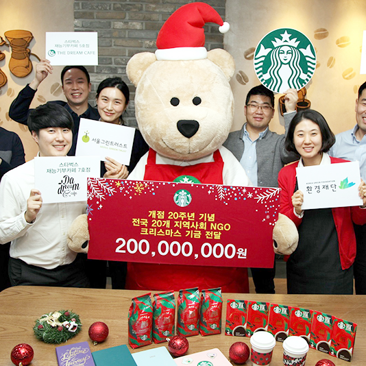 스타벅스, 크리스마스 시즌 기금 2억원 전달㈜스타벅스커피 코리아가 지난해 20주년을 기념해 고객 참여로 조성한 크리스마스 시즌 기금 총 2억원을 전국 20곳의 지역사회 NGO 및 기관에 전달을 마쳤다. 해당 기금은 지난해 10월 26일부터 12월 31일까지 약 2달간 크리스마스 프모로션 기간 동안 스타벅스 플래너 제공 및 판매 시 20원, 크리스마스 음료 1잔 판매 시 20원, 크리스마스 원두 판매 시 200원씩을 적립해 최대 2억원의 기금 조성을 목표로 마련되었다.