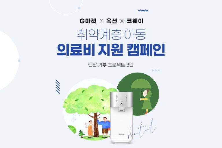 지마켓, 코웨이와 ‘취약계층 아동 의료비 지원’ 캠페인G마켓과 옥션을 통해 9월 한달간 진행되는 이번 캠페인은 취약계층 아동에게 의료비 지원을 목적으로 진행된다. G마켓과 옥션에서 코웨이 제품 렌탈시 1건당 3만원씩 기부하는 형태로, 기부금 적립은 정수기, 공기청정기, 비데, 매트리스 등 렌탈 제품이 모두 해당된다. 캠페인을 통해 모인 금액은 초록우산어린이재단을 통해 취약계층 아동의 수술비, 입원비, 검사비 및 약제비 지원에 쓰일 예정이다. 앞서 지마켓과 코웨이는 1월과 5월에 두 차례 캠페인을 통해 총 4,897만원의 기부금을 초록우산어린이재단에 전달한 바 있다