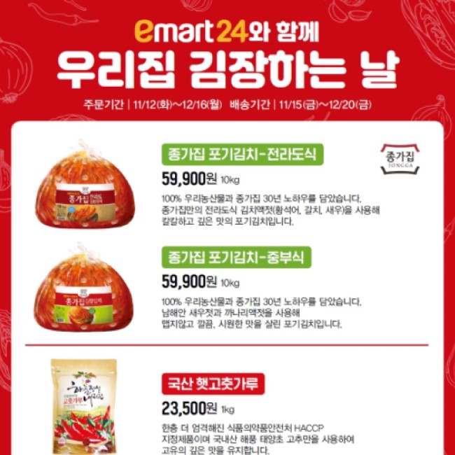 이마트24, 김장철 맞아 김치맛집으로 변신!이마트24가 김장철을 맞아 김포족(김장포기족)과 김장족을 위한 김치 9종, 김장 상품 4종 등 총 13종을 오는 12월 18일까지 예약 판매한다.