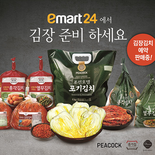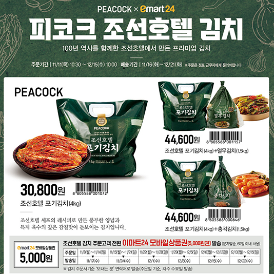 이마트24, 김장철 맞아 ‘피코크 조선호텔 김치’ 주문 센터로 변신!이마트24는 이달 11일부터 다음달 15일(오전 10시)까지 전국 매장을 통해 조선호텔 포기김치 4kg (30800원), 포기김치 4kg +열무김치 1.5kg(44600원), 포기김치 4kg +총각김치 1.5kg(44600원) 등 총 3종을 주문 판매한다. 이마트24는 프리미엄 김치를 보다 많은 혜택과 함께 경험해 볼 수 있도록 조선호텔 김치 구매 고객 전원에게 이마트24 모바일상품권(5천원)을 선물한다.