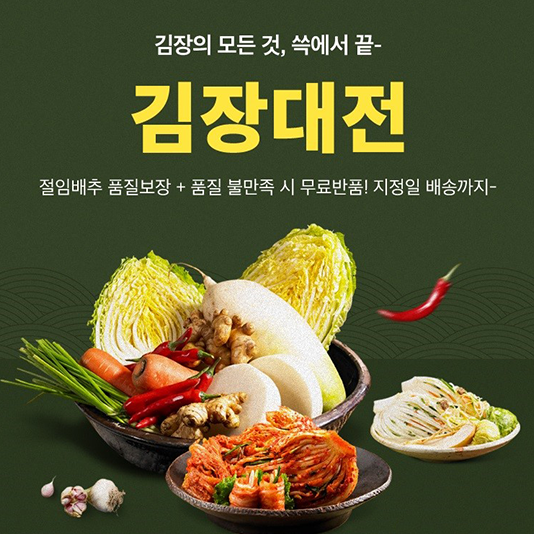 SSG닷컴, ‘김장대전’ 행사… ‘품질 보장 무료 반품’ 절임배추 사전 예약 시작SSG닷컴이 오는 15일까지 ‘김장대전’ 행사를 진행한다고 2일 밝혔다. 고품질의 김장철 식재료와 준비물, 가전제품 등을 합리적인 가격에 선보인다.