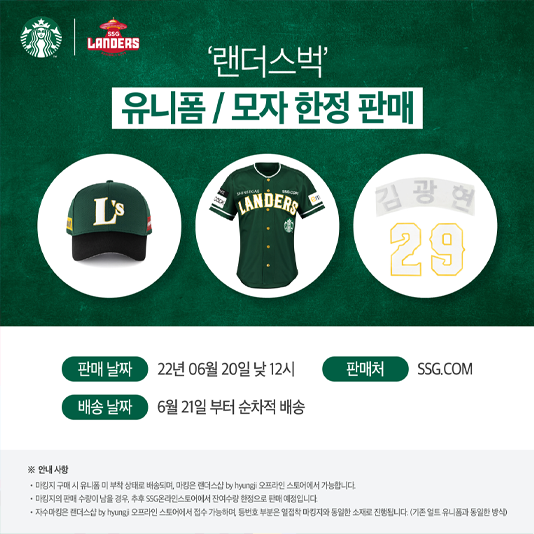 SSG랜더스(대표이사 민경삼, 이하 SSG)는 오는 24일(금)부터 26일(일)까지 인천SSG랜더스필드에서 진행되는 스타벅스 데이를 기념해, 20일(월) 오후 12시부터 SSG와 스타벅스(SCK컴퍼니)가 협업해 출시한 ‘랜더스벅’ 유니폼과 모자, 마킹지 판매를 실시한다.
