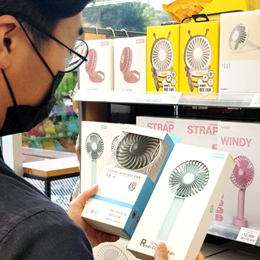 무더위 속 마스크 착용에 시원한 휴대용선풍기(손풍기) 열풍!무더위에 마스크까지 착용해야 하는 상황에서, 휴대용 선풍기, 일명 손풍기를 찾는 고객이 크게 늘고 있다. 이마트24가 6월(1일~14일) 손풍기 매출을 확인한 결과, 전월 동기간 대비 14배나 증가한 것으로 나타났다.