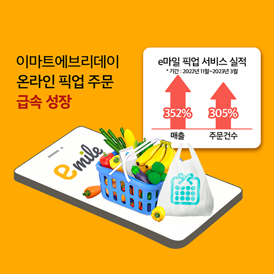 이마트에브리데이, 온라인 픽업 주문 서비스 4개월간 4.5배 성장㈜이마트에브리데이(대표이사 김성영)가 자사 온라인 쇼핑 플랫폼 ‘e마일’을 통해 선보인 픽업 주문 서비스가 지난 3월까지 4개월 간, 약 4.5배의 매출 증가를 기록하며 온·오프라인 연계성을 한층 강화했다.