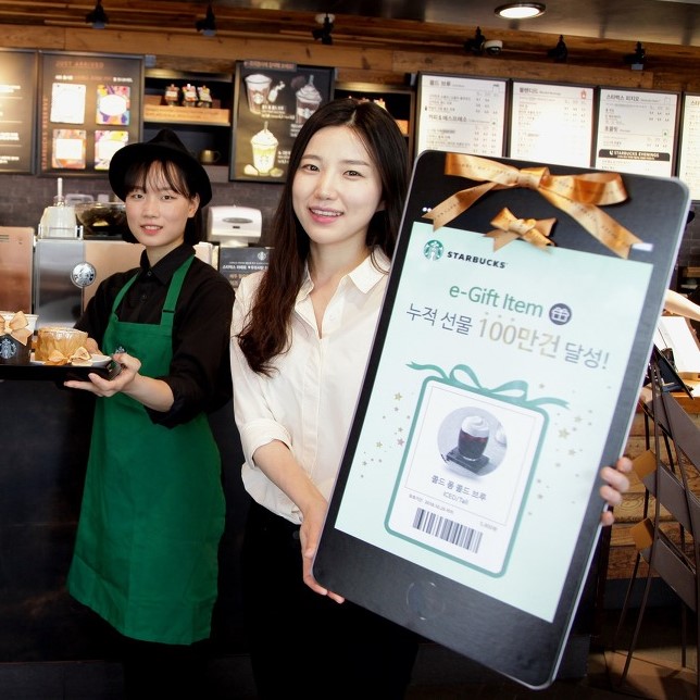 ㈜스타벅스커피 코리아가 대표적인 선물 서비스인 ‘e-Gift Item’(물품형 상품권)의 누적 선물 건수가 100만건을 달성했다고 밝혔다.