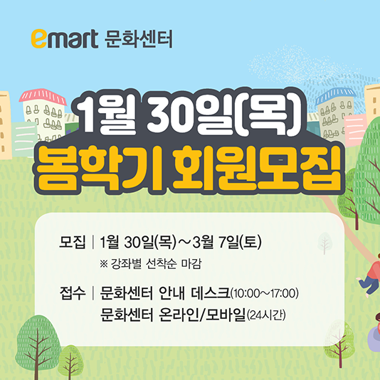 이마트 문화센터 2020 봄학기 회원모집이마트가 2020 봄학기 문화센터 강좌 회원 모집에 나선다. 이마트는 오는 1월 30일(목)부터 3월 7일(토)까지 전국 80개 문화센터에서 점포 별 평균 400여개 강좌에 대한 회원 모집을 진행한다.