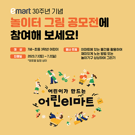 이마트가 미래 잠재 고객인 어린이 고객 확보에 나섰다. 이마트가 오는 7월 1일과 2일 이틀 간 7~10세(2017년-2014년생) 어린이 고객을 대상으로 ‘놀이터 그림 공모전’을 진행한다.