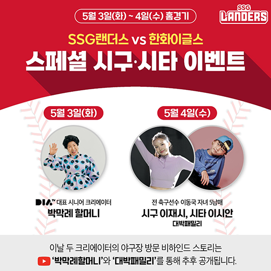 보도자료 SSG랜더스, 어린이날 시리즈 맞아 ‘다이아 티비’와 콜라보 추진 SSG랜더스(대표이사 민경삼, 이하 SSG)는 5월 3일(화)과 4일(수) 인천SSG랜더스필드에서 열리는 한화 이글스와의 홈경기에 ‘다이아 티비’의 유명 크리에이터들과 콜라보 이벤트를 진행한다. 2022.04.28 신세계야구단
