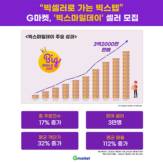 G마켓, “빅셀러로 가는 빅스텝”…‘빅스마일데이’ 참여 셀러 모집국내 대표 온라인 마켓플레이스 G마켓이 4월 30일까지 국내 최대 온라인 쇼핑축제 ‘빅스마일데이’에 참여할 판매고객을 모집한다.