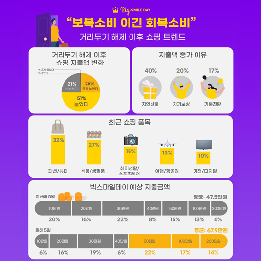 지마켓글로벌, ‘보복소비 이긴 회복소비’…10명 중 8명, “일상회복 후 씀씀이 커져”사회적 거리두기가 해제된 이후, 일상이 회복되며 소비심리도 살아나는 모양새다. 국내 대표 온라인마켓플레이스 G마켓과 옥션은 상반기 최대 쇼핑 축제 ‘빅스마일데이’를 맞아 16일부터 20일까지 5320명의 고객을 대상으로 쇼핑 계획에 대한 설문조사를 진행했다.