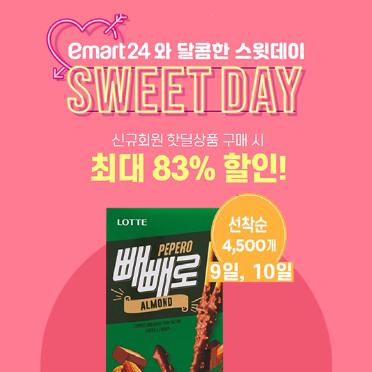 이마트24, 모바일로 빼빼로 2만4천개 깜짝 핫딜!빼빼로데이가 다가오면서 유통업체의 깜짝 이벤트가 늘어나고 있다. 이마트24는 이달 9일(월)부터 빼빼로데이 핫딜 이벤트를 진행한다. 빼빼로데이를 겨냥한 이색 김밥도 판매한다.