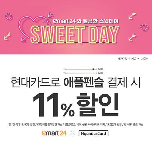 이마트24, 빼빼로데이 이벤트도 뉴노멀!시대의 변화에 따라 편의점 빼빼로데이 행사도 진화하고 있다. 이마트24는 전국 21개 애플 정품 액세서리 판매 매장*에서 현대카드로 ‘Apple 펜슬’(Apple Pencil) 구매 시 11% 할인하는 이색 이벤트를 진행한다.