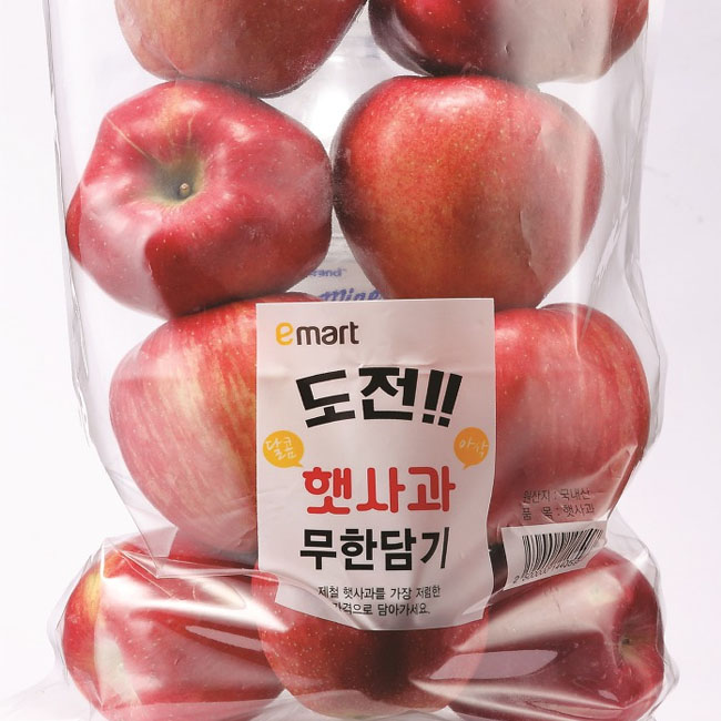 이마트는 오는 19일부터 25일까지 전국 산지에서 총 350톤, 10억 물량의 햇사과(홍로)를 공수해 1봉을 1만원에 판매한다. 무한담기 전용 봉투에 사과를 가득 담으면 평균 14개(3.5~3.7kg)의 사과가 들어가 1개당 710원 선이다.