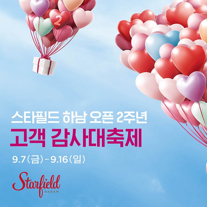 스타필드 하남, 개점 2주년 감사 대축제2016년 9월 오픈한 쇼핑테마파크 스타필드 하남이 개점 두 돌을 맞아 오는 9월 7일부터 16일까지 ‘스타필드 하남 개점 2주년 감사 대축제’을 진행한다.