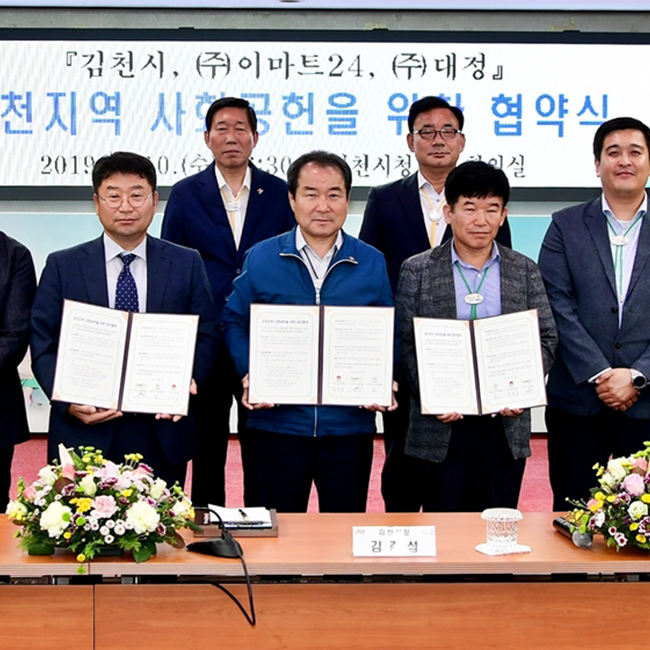 이마트24, 김천시와 손잡고 지역상생 활성화 나선다!이마트24가 김천시청 2층 회의실에서 김천시, ㈜대정과 함께 김천지역의 소외계층 복지 향상 및 지역 경제 활성화를 위한 업무협약을 체결했다.이마트24는 김천시의 아동복지시설, 노인복지시설, 장애인복지시설에 FF공장에서 생산된 이마트24의 프레쉬푸드 상품(도시락, 김밥, 샌드위치 등)을 지원한다.