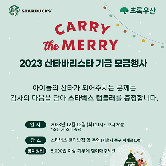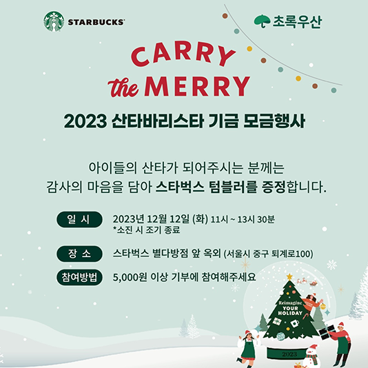 스타벅스, 12월 12일부터 10일간 최대 5억 원 기금 조성한다스타벅스 코리아(대표이사 손정현)가 크리스마스 시즌을 맞아 12월 12일부터 10일간 매장의 수익금 중 일부를 기금으로 조성해 최대 5억 원을 지역사회 NGO 단체에 전달하는 ‘캐리 더 메리(CARRY the MERRY) 나눔의 날’ 행사를 진행한다.
