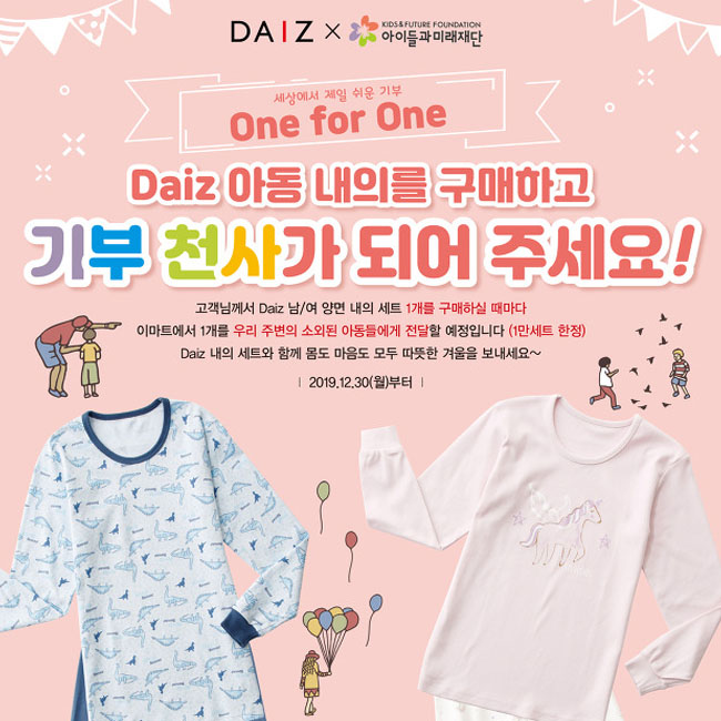 데이즈 아동내의 구매하고 기부천사가 되어주세요이마트는 12월 30일부터 이마트에서 데이즈 남/여 아동 양면 내의 세트를 구매하면 소비자가 구매한 수량만큼을 이마트가 기부하는 One for One 방식의 캠페인을 진행한다고 밝혔다. 해당 캠페인은 1만장 기부를 목표로 진행하며, 캠페인 기간 후 이마트는 아이들과 미래 재단, 한국 그룹홈협회를 통해 전국 보육원, 영아원, 아동센터 등에 아동당 2벌씩 내의를 기증할 계획이다.