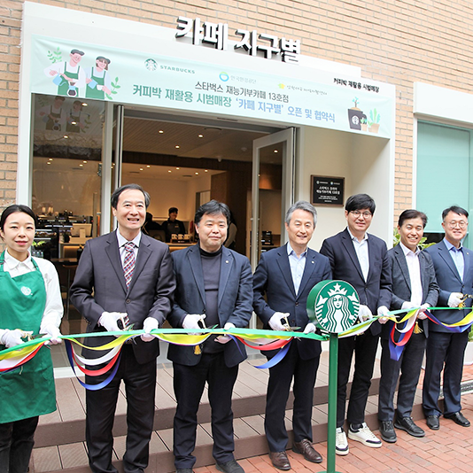 스타벅스, 민관 협력 최초의 커피찌꺼기 재활용 시범 매장으로 재능기부 카페 13호점 오픈스타벅스 코리아(대표이사 손정현)가 한국환경공단(이사장 안병옥), 인천서구지역자활센터(센터장 조영정)와 함께 3월 17일 인천시 서구에 위치한 한국환경공단 본사 내 ‘카페 지구별’을 스타벅스 재능기부 카페 13호점으로 오픈하고 커피찌꺼기 재자원화 촉진 및 지역사회 취약계층 일자리 창출을 위한 업무 협약을 체결했다.