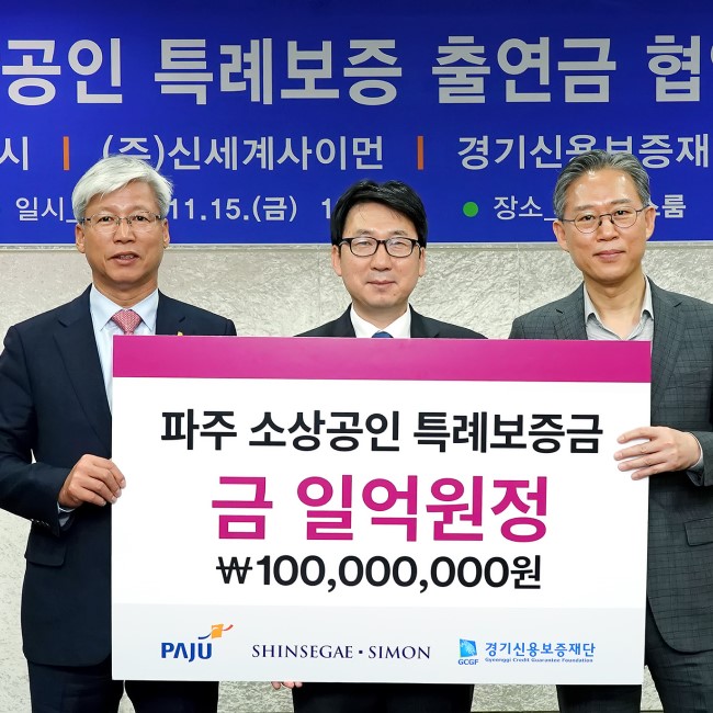 신세계사이먼, 파주 소상공인을 위한 특례보증금 출연신세계사이먼(대표 : 조창현)이 파주시 소상공인들의 경영안정 지원을 위해 1억원의 특례보증금을 출연한다.