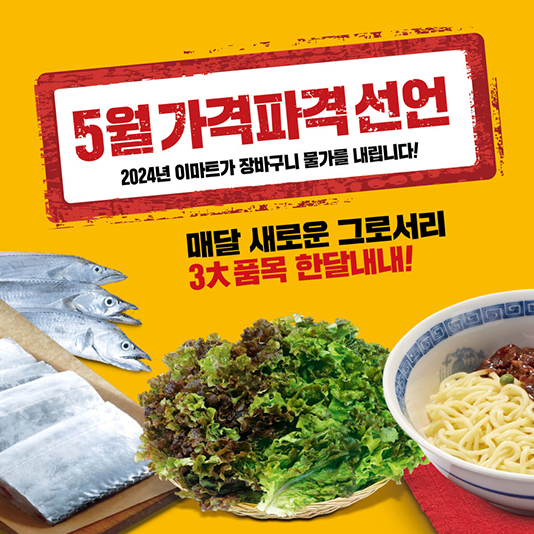 이마트가 고물가를 역행하는 ‘가격파격’ 선언을 5월에도 이어간다. 이번 5월의 가격파격 3대 식품은 ‘채소-델리-수산’으로 구성하여 한달 내내 식탁에 올라가는 품목으로 선정했다. 5월 가격파격은 5월 3일(금)~30일(목) 한달간 ‘990원 상추-중화반점 3종-3천원대 갈치’를 메인으로 하여 먹거리 물가 안정에 나선다.