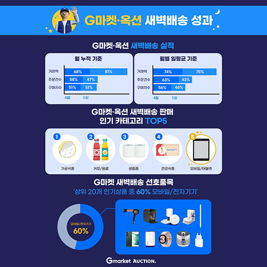 G마켓, ‘새벽배송’ 영역 확장 눈길… 상품 다각화 통했다G마켓·옥션이 지난 2월 도입한 새벽배송 서비스가 꾸준한 성장세를 보이며 안착하고 있다. 특히 휴대폰, 드라이기, 전기면도기 등 소형 디지털기기가 인기 주문 품목에 이름을 올리며, 신선식품 위주였던 새벽배송 영역 확장에 한 몫하고 있다.