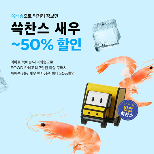 SSG닷컴, ‘쓱찬스’로 장보면 냉동새우가 ‘반 값’SSG닷컴은 22일과 23일 단 이틀 동안 쓱배송과 새벽배송으로 식품을 7만원 이상 구매하면 냉동새우를 최대 50% 할인된 가격에 구매할 수 있는 ‘쓱찬스’ 행사를 진행한다고 22일 밝혔다. SSG닷컴은 어느 요리에나 부담 없이 잘 어울리면서도 외식하는 느낌을 줄 수 있는 식재료라는 점에서 이번 행사 품목으로 새우를 선정했다.