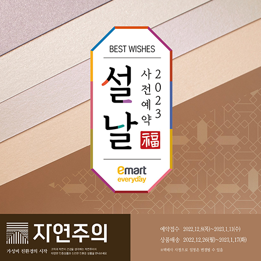 이마트에브리데이, 2023년 설 선물세트 사전예약 판매 개시(2022년 12월 8일) ㈜이마트에브리데이(대표이사 김성영)가 12월 8일부터 내년 1월 11일까지 35일간 2023년 설 선물세트 사전 예약판매를 진행한다.