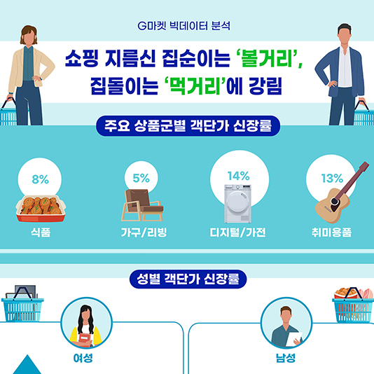 G마켓, 빅데이터 분석… 여성은 TV, 남성은 식품에 지름신 강림국내 대표 마켓플레이스 G마켓이 2021년 한 해 구매 객단가 기반으로 빅데이터를 분석한 결과, 전년 대비 여성은 TV를 비롯해 각종 영상 시청을 위한 디지털 가전에, 남성은 먹거리와 취미생활 등에 더 과감하게 지갑을 연 것으로 조사됐다.