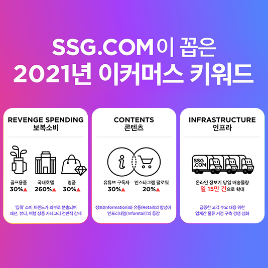 SSG닷컴, “SSG닷컴이 꼽은 올해 이커머스 키워드는”SSG닷컴이 올해 1월부터 11월까지의 판매 데이터를 분석, 이커머스 업계의 주요 키워드를 ‘보복소비’와 ‘콘텐츠’, ‘인프라’의 세 가지로 압축해 28일 발표했다. 지난해와 마찬가지로 온라인 소비 트렌드의 큰 축은 역시 ‘비대면’이었지만 인기를 끈 상품 카테고리가 확연하게 달라졌다.