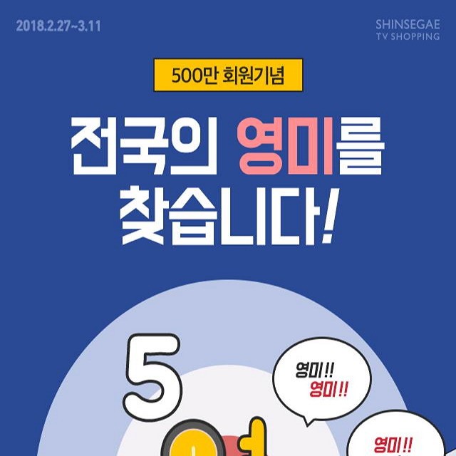 신세계TV쇼핑, 가입자수 500만명 돌파신세계TV쇼핑은 500만 돌파 기념과 더불어 최근 이슈가 된 컬링을 홍보하고자 3월 11일(일)까지 ‘전국에 영미를 찾습니다’ 이벤트를 진행