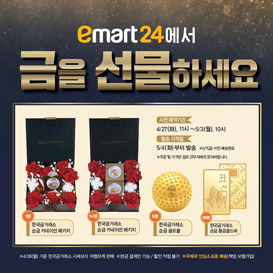 보도자료 이마트24, “순금카네이션으로 마음 전하세요” 이마트24는 어버이날을 맞아 한국금거래소와 손잡고 순금카네이션, 순금골프공, 골드바 선물세트를 준비했다. 2021.04.26 이마트24