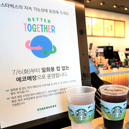 스타벅스, 일회용컵 없는 매장, 제주지역 4개점에서 오늘부터 시작!㈜스타벅스커피 코리아는 오늘부터 스타벅스 제주 지역 4개 매장에서 일상 생활 속 개인컵 사용의 습관화를 위한 친환경 활동인 일회용컵 없는 매장 운영을 본격적으로 시작한다. 스타벅스 일회용컵 없는 매장은 제주서해안로DT점, 제주애월DT점, 제주칠성점, 제주협재점이며, 해당 매장에서는 모든 음료 구입 시 머그컵, 개인컵 및 리유저블컵으로 음료를 제공한다.