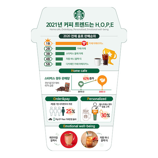 ㈜스타벅스커피 코리아(대표이사 송호섭)가 많은 것들이 변했던 지난 한 해 스타벅스의 운영 빅데이터를 토대로 올해 예상되는 네 가지 커피 트렌드를 예측했다.