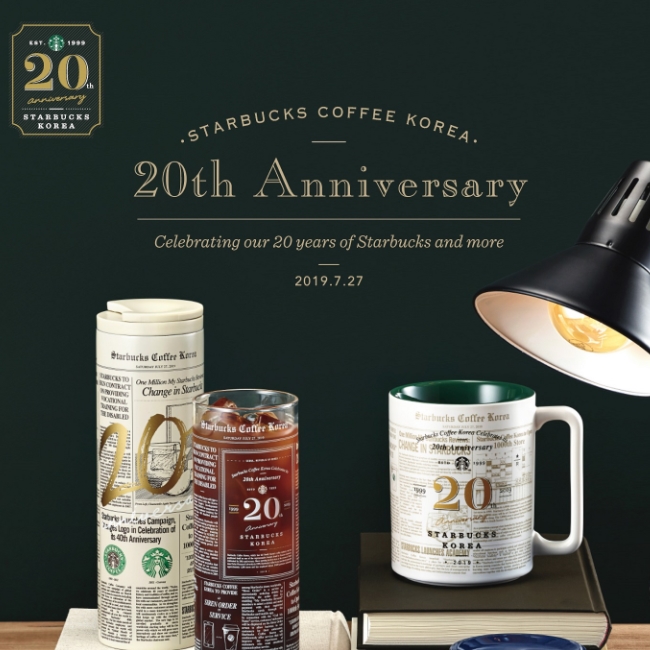 스타벅스는 올해 20주년을 맞아 ‘20주년 기념 펜’과 20주년 기념 텀블러 2종, 머그 1종, 글라스 1종 등을 출시하며, 스타벅스 코리아의 첫 개점부터 현재까지의 기념적인 순간들에 대한 실제 기사자료를 일부 편집한 영자신문 형태의 디자인을 담았다.