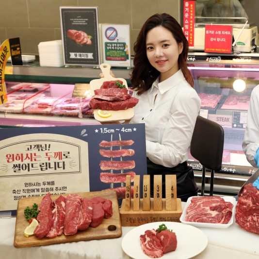 이마트, 한우데이 맞아 한우 전 품목 연중 최저가 수준 판매이마트는 2016년 말 경기도 광주 미트센터에 숙성 한우 창고를 만들어 축산 매장에 고기 두께를 2~3.7cm로 한 ‘스테이크 전용 매장’을 만들었다.