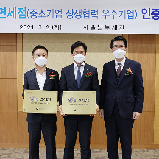 신세계면세점 본점이 서울본부세관으로부터 중소·중견기업과의 상생협력 활동의 공로를 인정받아 국내 최초로 ‘W·E 면세점 인증’을 3월 2일 취득했다.
