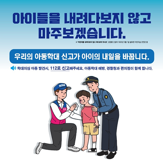 보도자료 이마트24, 경찰청과 손잡고 아동학대 신고 캠페인 진행! 이마트24가 경찰청과 손잡고 아동학대 신고 캠페인에 나선다고 23일 밝혔다. 이마트24가 이번 캠페인을 진행하게 된 것은 아동학대 신고 활성화를 통해 학대 아동을 조기 발견하고 피해를 최소화하기 위함이다. 2020.08.24 이마트24